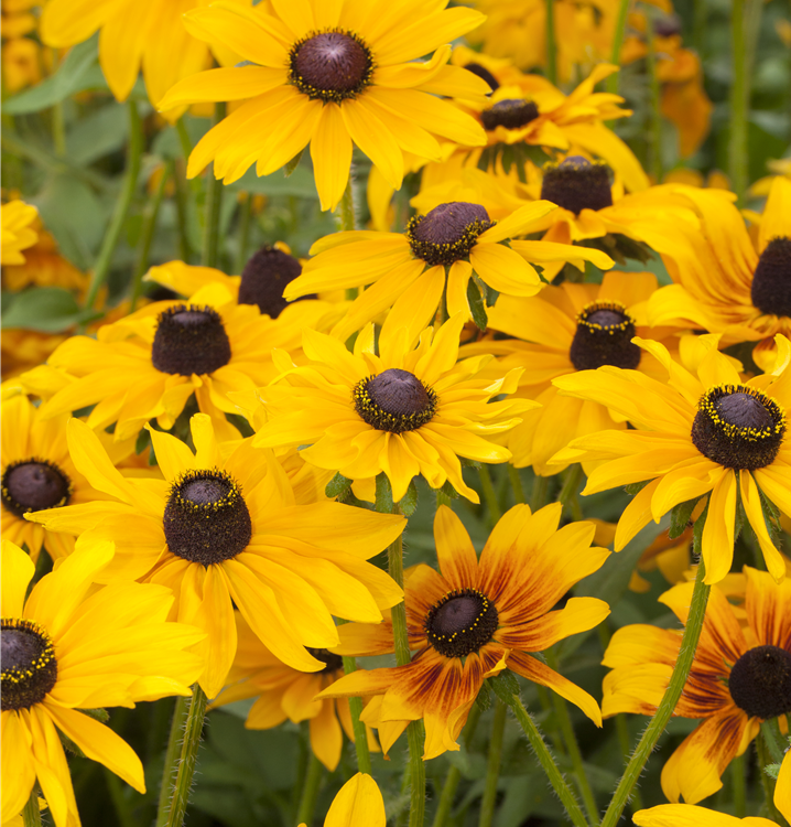 Der Raue Garten-Sonnenhut (Rudbeckia hirta) ist eine buschige, rhizombildende Staude, die von Mai bis September orangegelbe, radförmige, in Trauben angeordnete Blüten bildet. An einem sonnigen bis halbschattigen Standort mit durchlässigem, nährstoffreichem Boden erreicht er gewöhnlich eine Höhe von ca. 1 m und wird ca. 60 cm breit. Der Raue Garten-Sonnenhut ist gut frostverträglich.