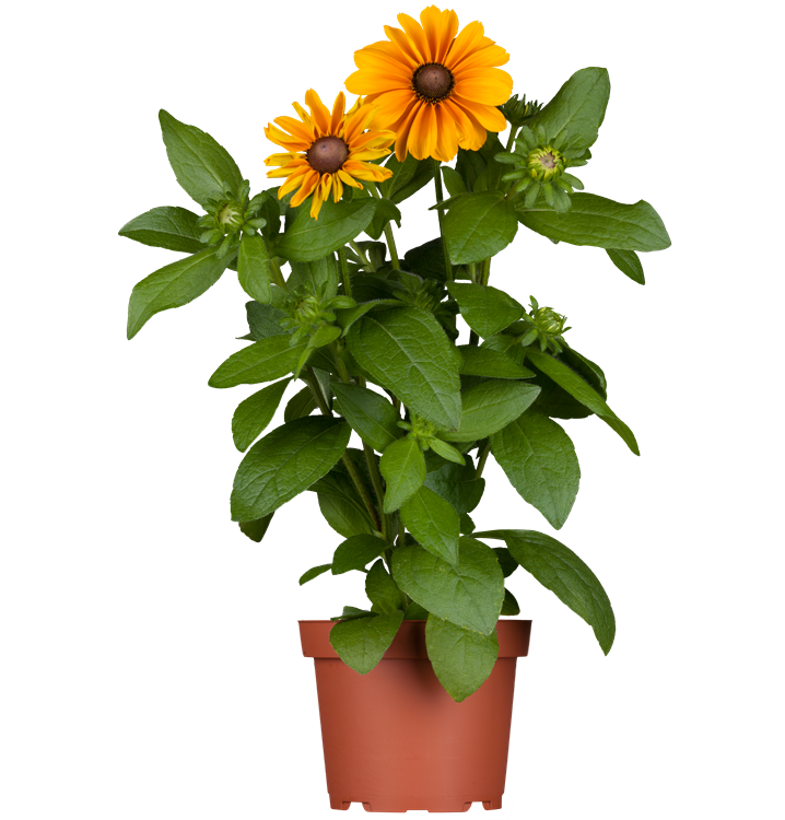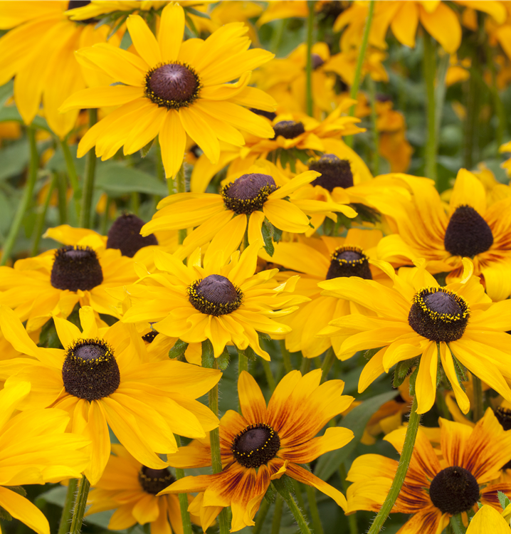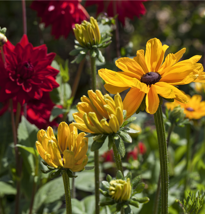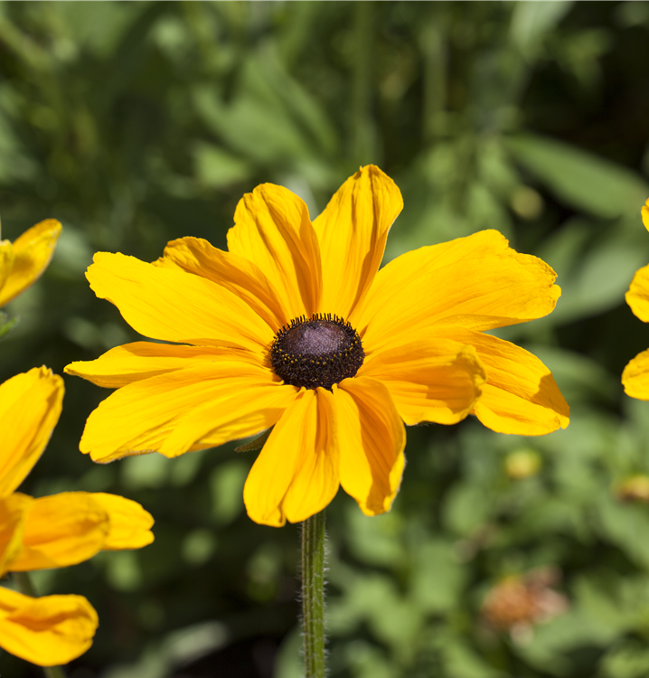 Rudbeckia hirta bildet radförmige, in Trauben angeordnete, orangegelbe Blüten ab Mai.