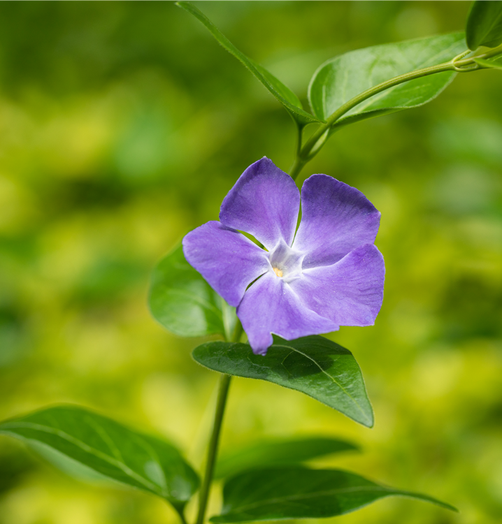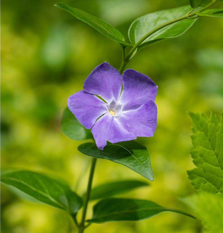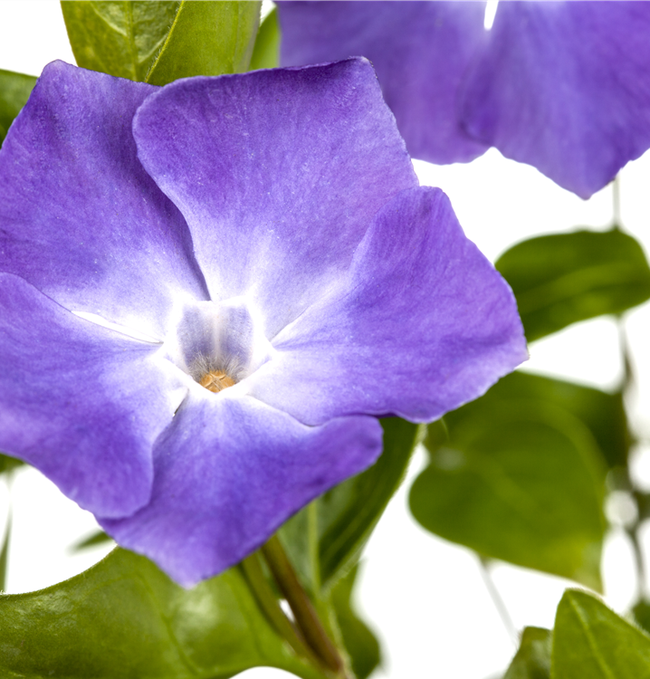 Vinca major bildet radförmige, blauviolette Blüten ab Mai. Diese werden etwa 3 - 4 cm groß.