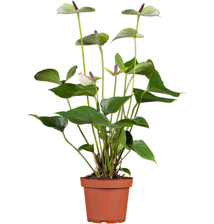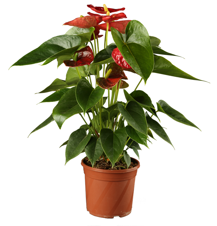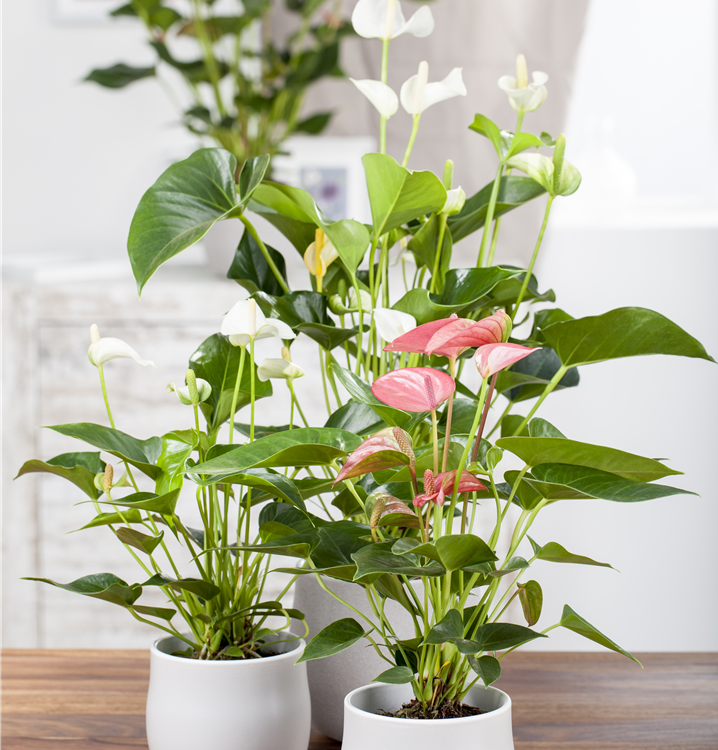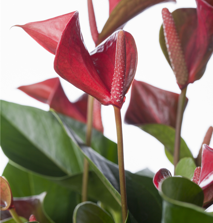 Die dunkelroten, lachsrosafarbenen, roten, weißen Blüten der Flamingoblume erscheinen in Kolben von Januar bis Dezember.