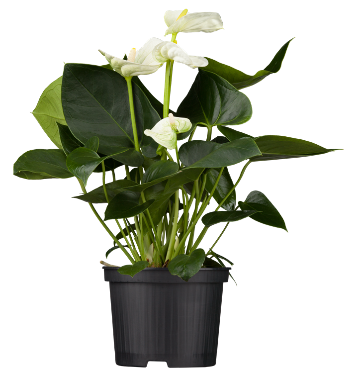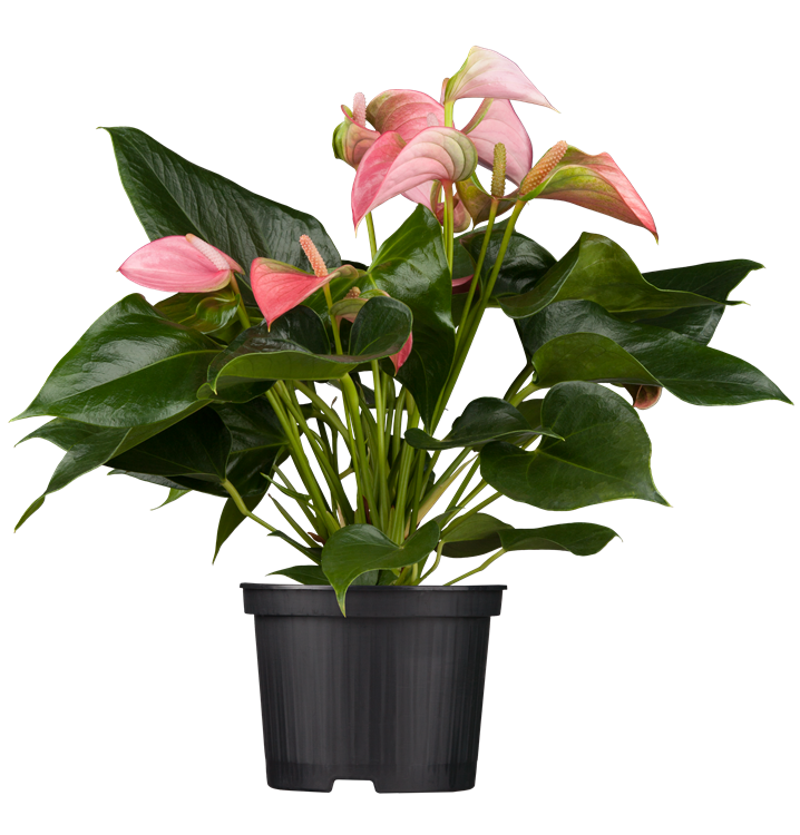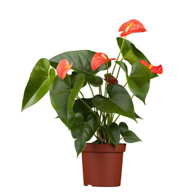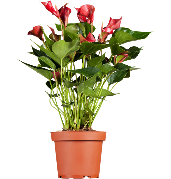 Die Flamingoblume (Anthurium x andreanum) ist eine dunkelrot, lachsrosa, rot oder weiß blühende Pflanze, die herzförmige, dunkelgrüne, glänzende Blätter trägt. Diese aufrechte Pflanze gedeiht am besten an einem sonnigen bis halbschattigen Standort.