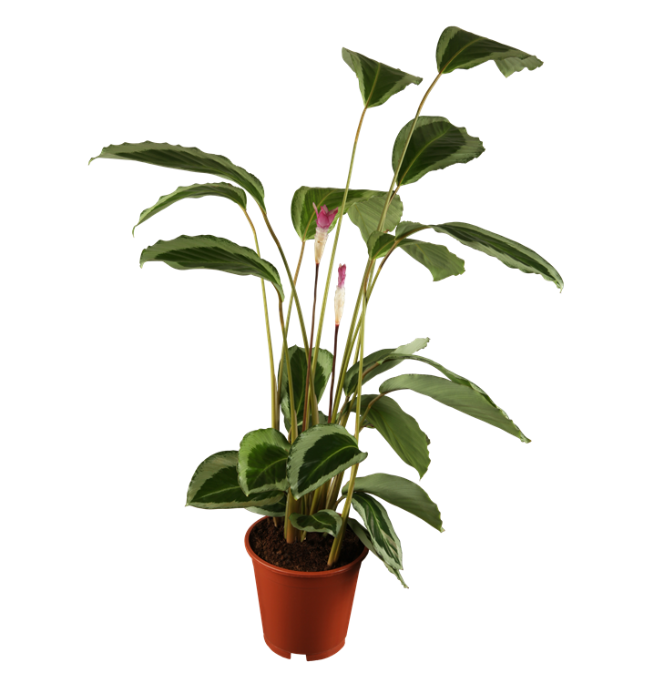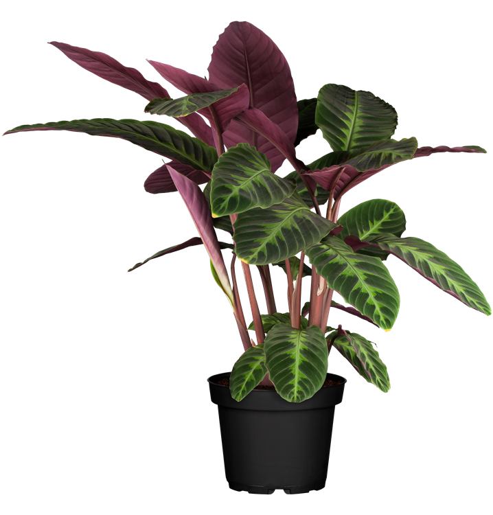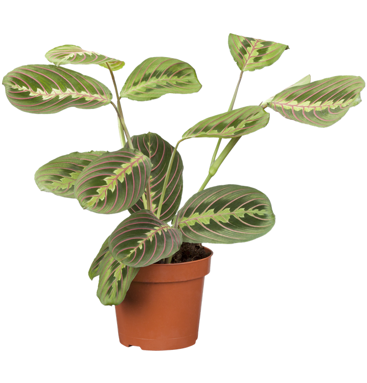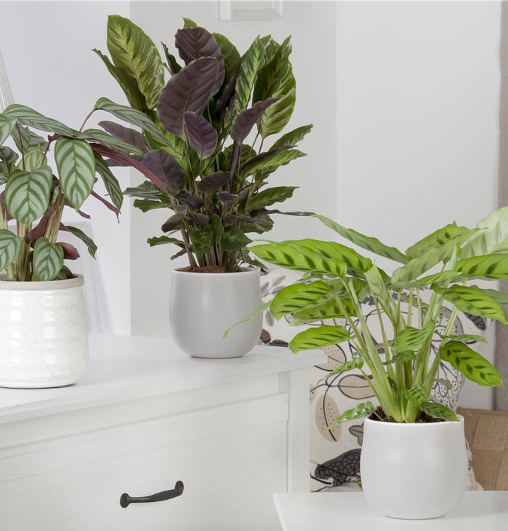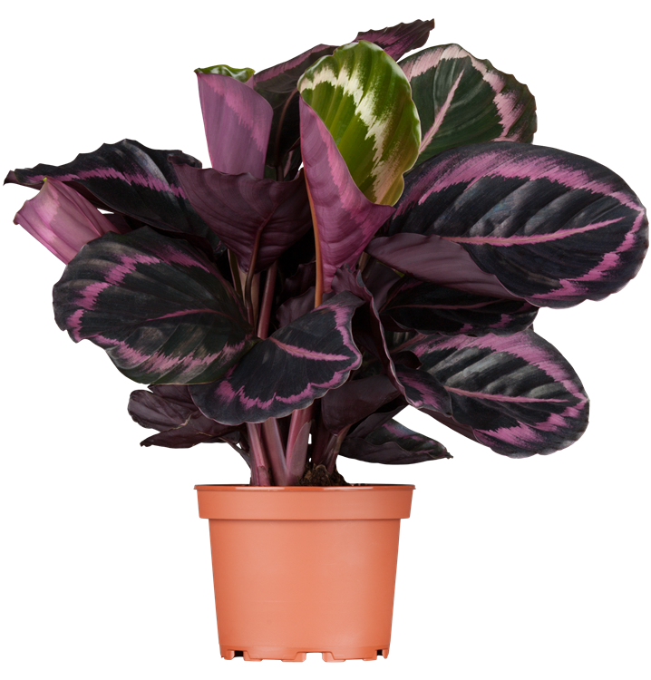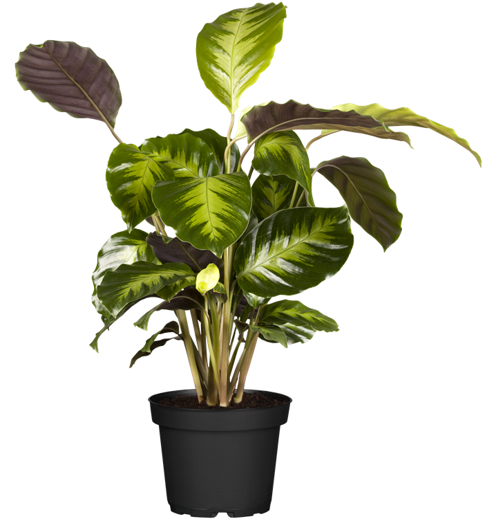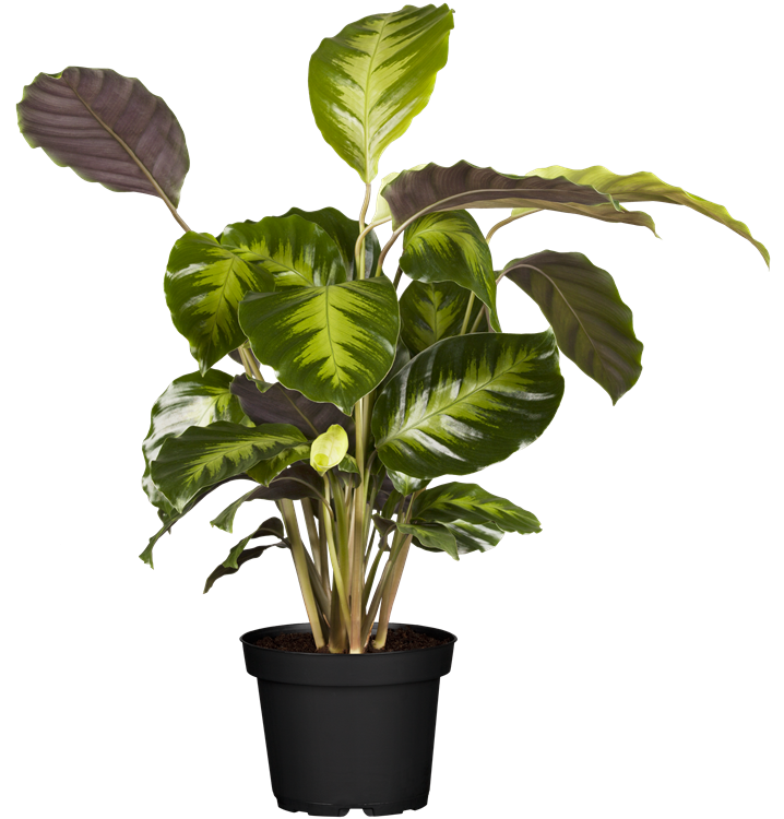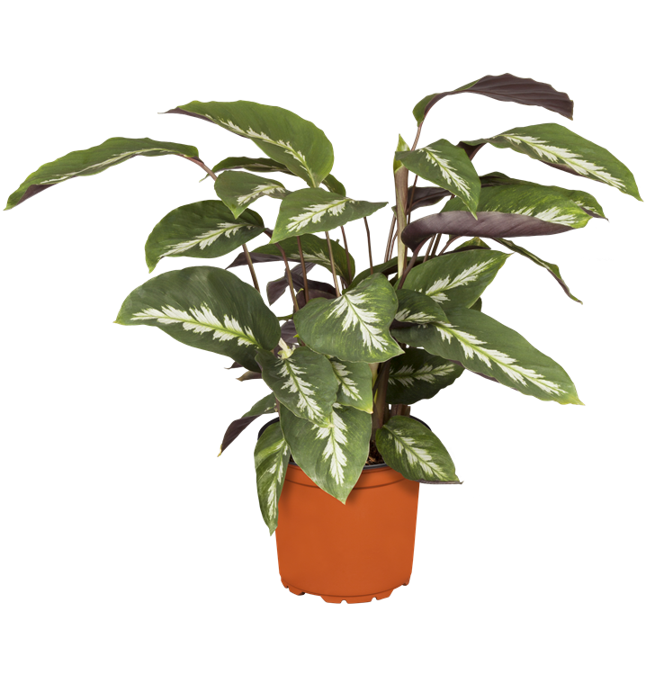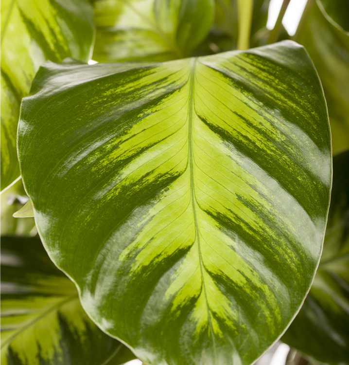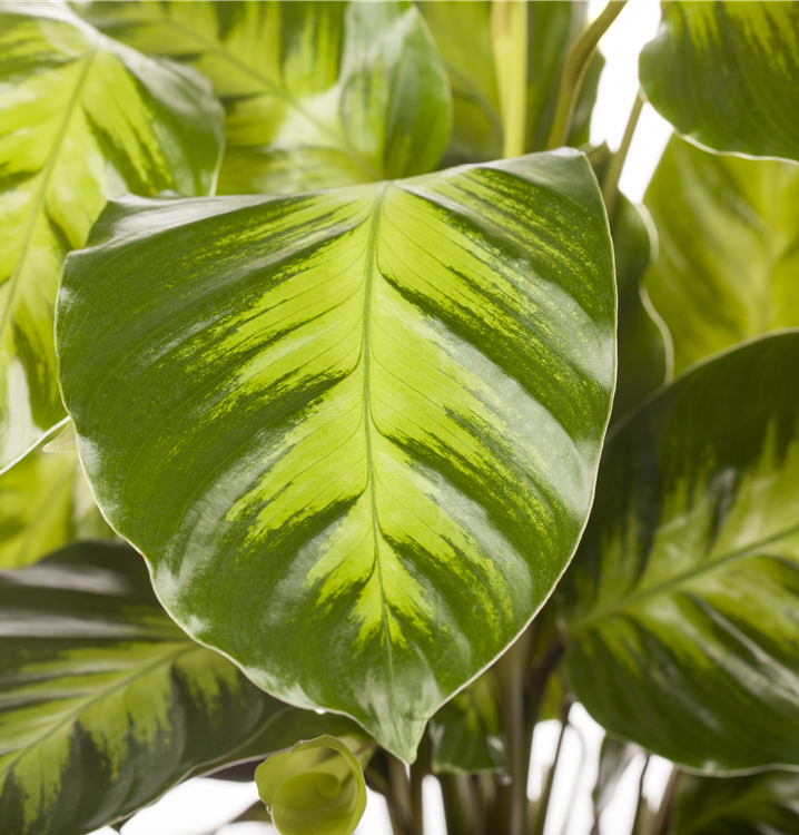 Die Korbmarante (Calathea) ist eine Pflanze mit dekorativen, mehrfarbigen Blättern. Sie sind eiförmig und gewellt. Diese buschige und aufrechte Pflanze gedeiht am besten an einem halbschattigen Standort.