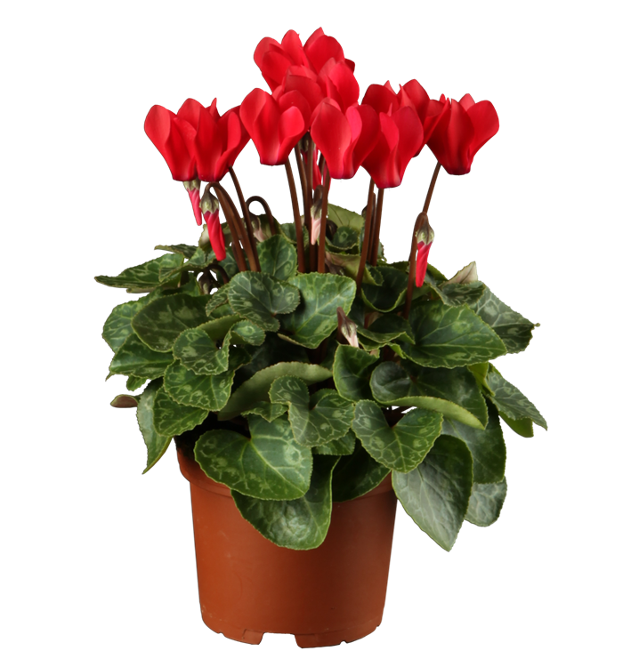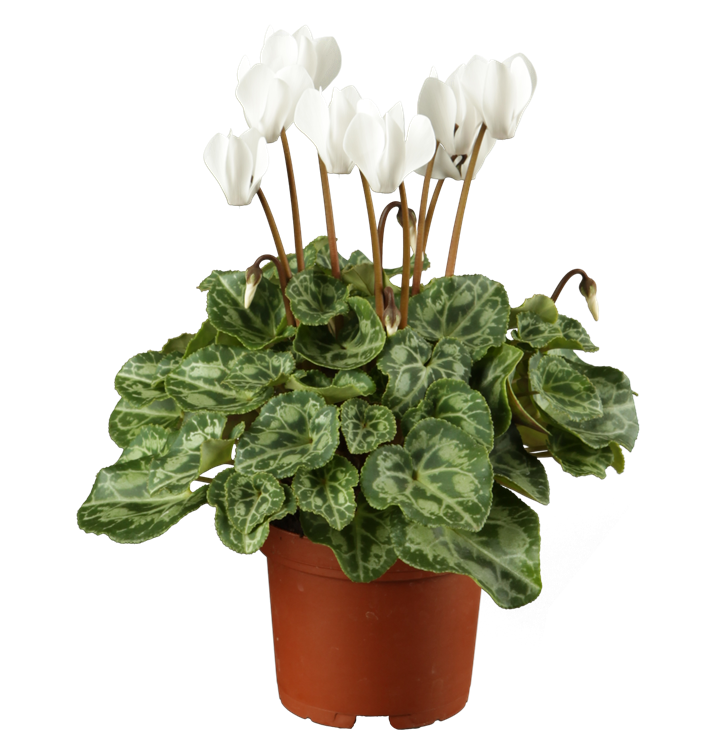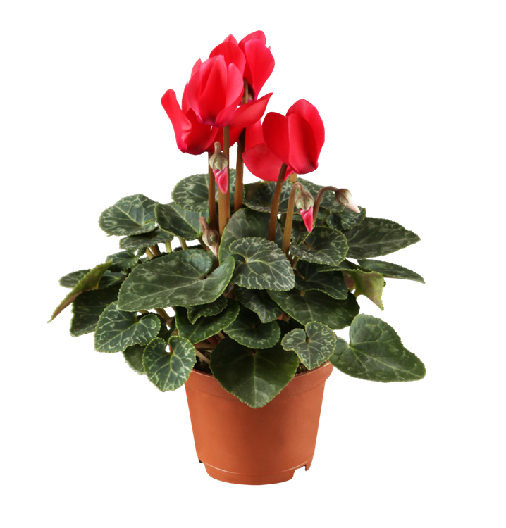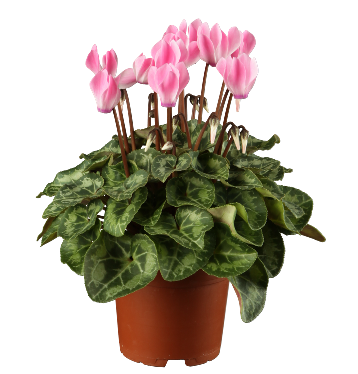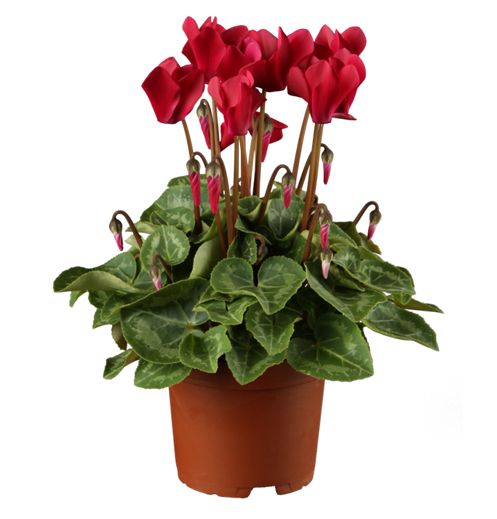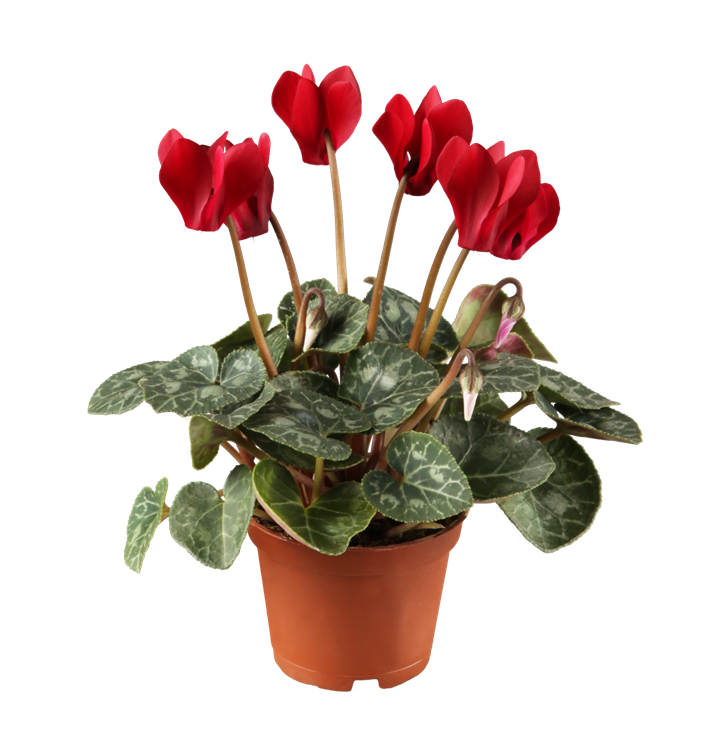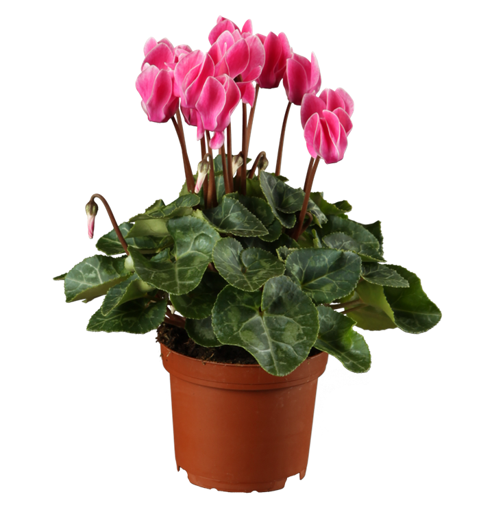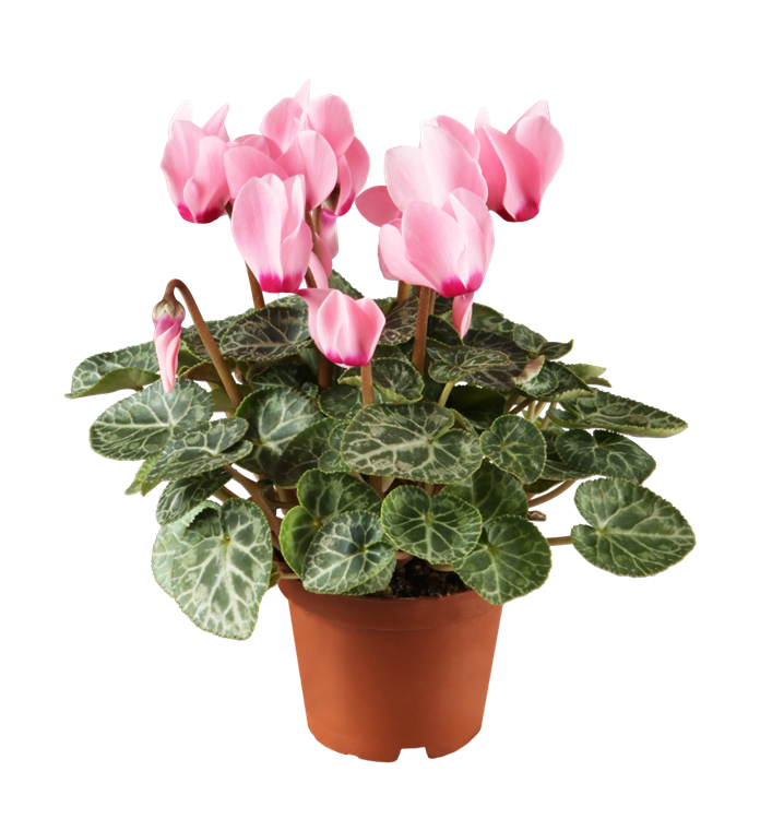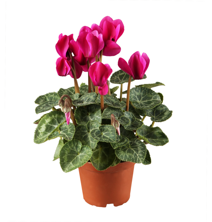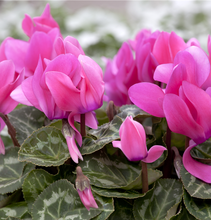 Das Zimmer-Alpenveilchen (Cyclamen persicum) ist eine weiß, pink, rosa, rot, dunkelrot oder lila blühende Pflanze, die herzförmige, mehrfarbige, gezähnte Blätter trägt. Seine Blüten verströmen einen angenehmen Duft und erscheinen von September bis April. Diese aufrechte und dichte Pflanze gedeiht am besten an einem sonnigen bis halbschattigen Standort.