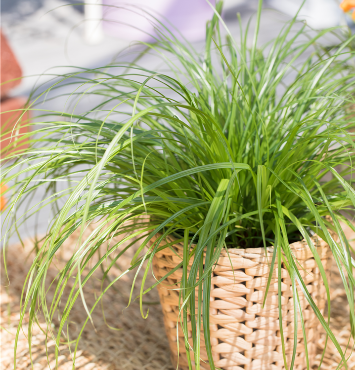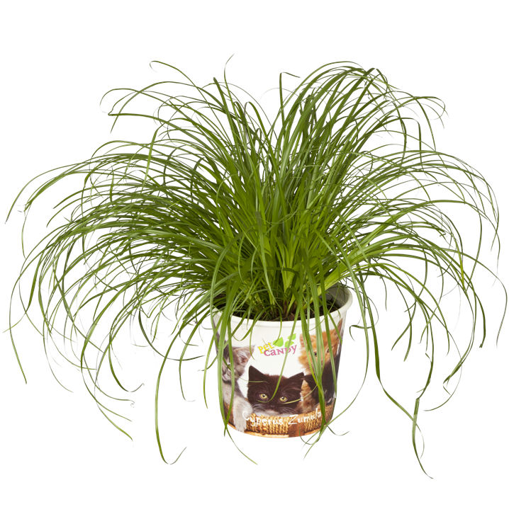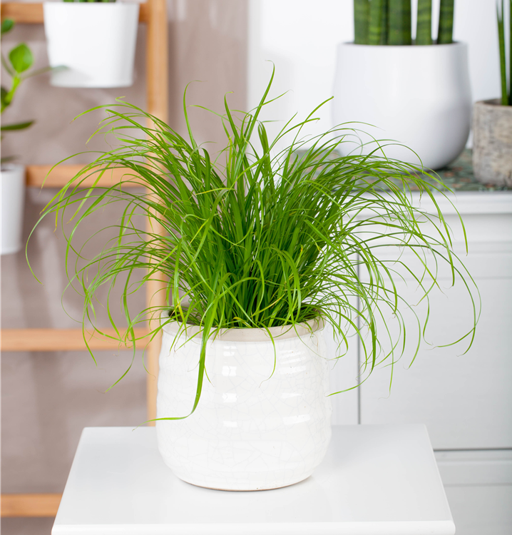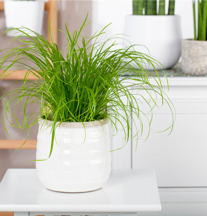 Das Katzengras (Cyperus zumula) trägt mittelgrüne, lanzettliche Blätter. Diese horstbildende und überhängende Pflanze gedeiht am besten an einem hellen Standort.