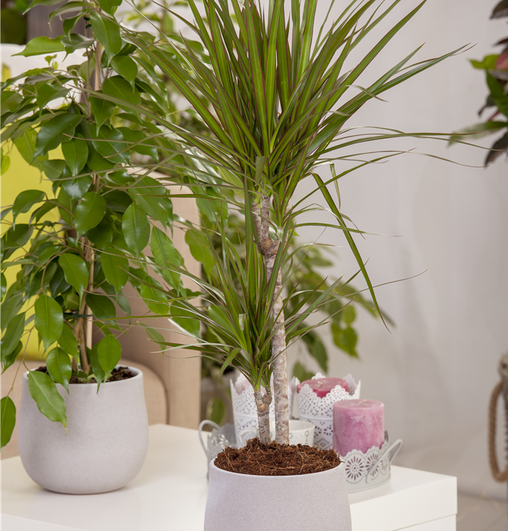 Der Drachenbaum (Dracaena marginata) zählt zu den pflegeleichten Pflanzen, die sehr dekorative, dunkelgrüne Blätter besitzt. Sie sind lineal. Diese aufrechte Pflanze gedeiht am besten an einem sonnigen bis halbschattigen Standort.