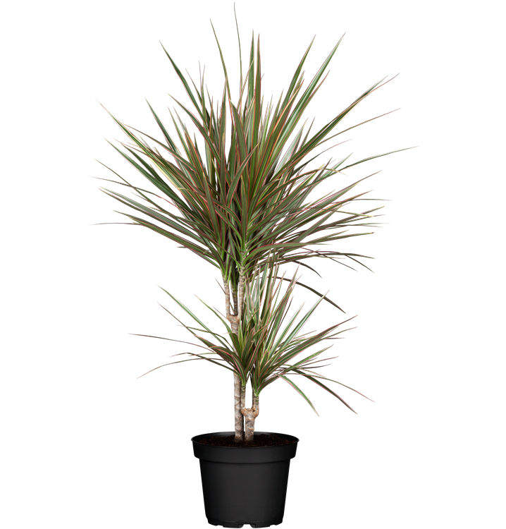 Hoher Blattschmuckwert. Die immergrünen Blätter des Drachenbaums sind dunkelgrün, lineal und weisen einen dunkelroten Rand auf.