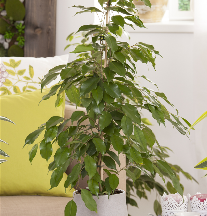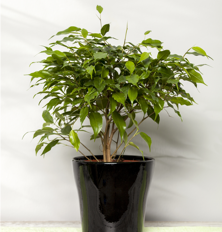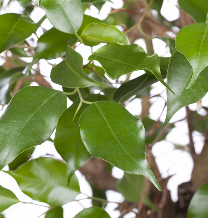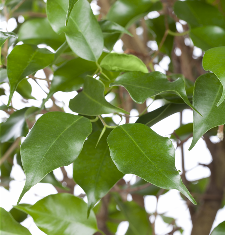 Die Birken-Feige (Ficus benjamina) trägt dunkelgrüne, glänzende Blätter. Diese aufrechte und verzweigte Pflanze gedeiht am besten an einem sonnigen bis halbschattigen Standort.