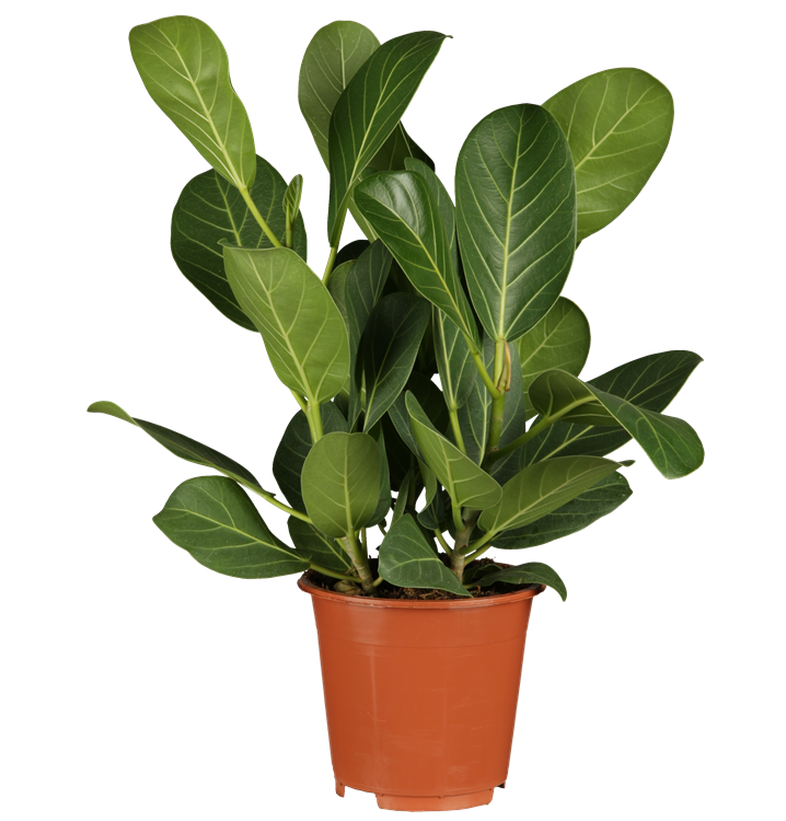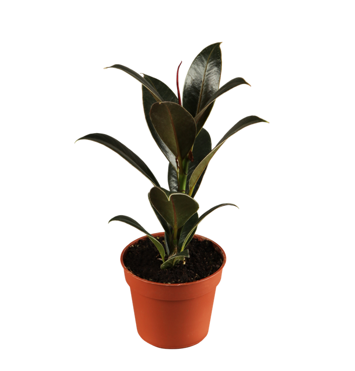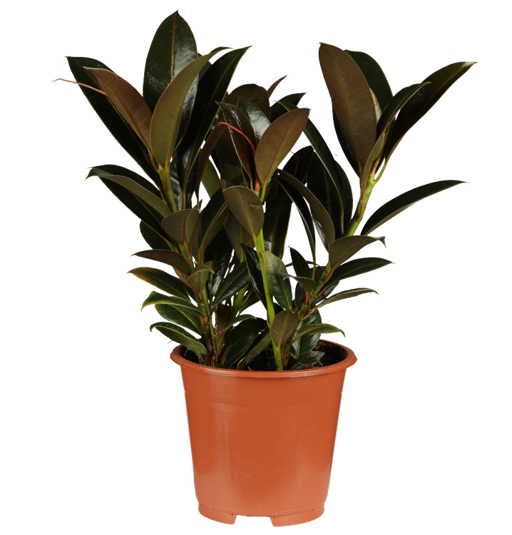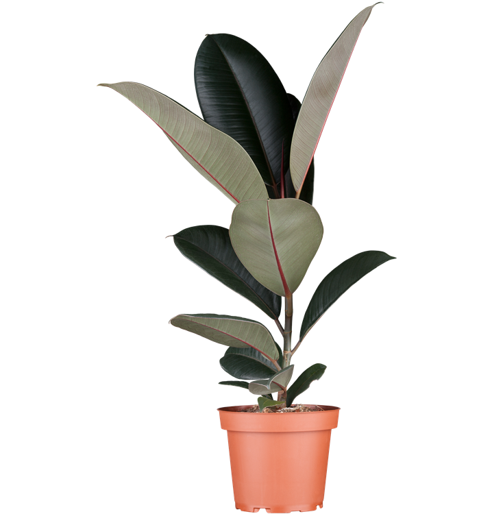 Der Gummibaum (Ficus elastica) trägt dunkelgrüne, breit lanzettliche, glänzende Blätter. Diese aufrechte und verzweigte Pflanze gedeiht am besten an einem halbschattigen Standort.