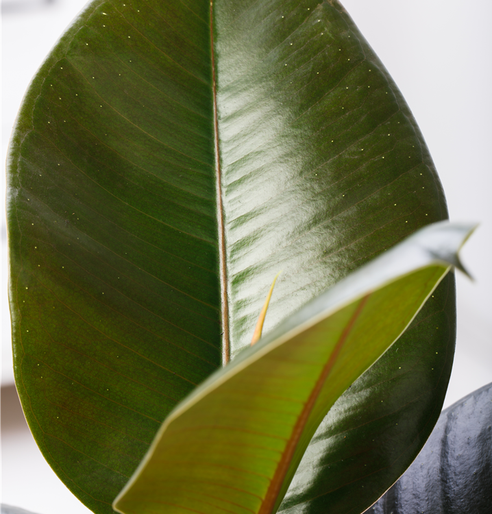 Die immergrünen Blätter des Gummibaums sind dunkelgrün, breit lanzettlich, glänzend.