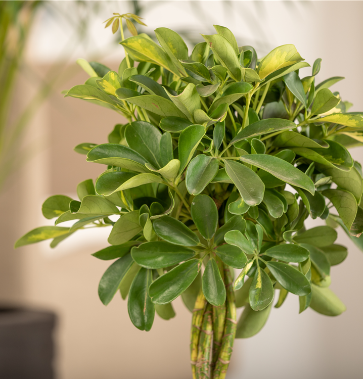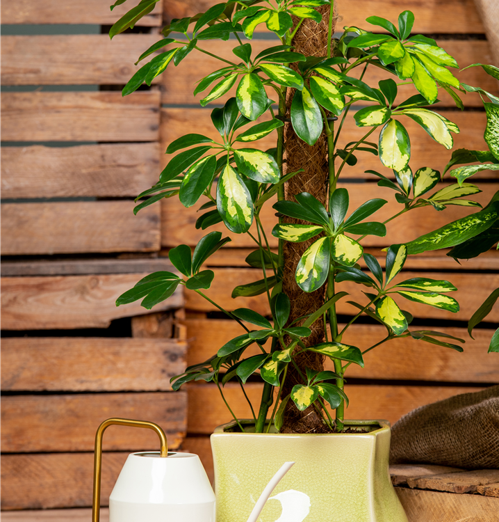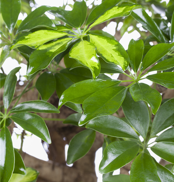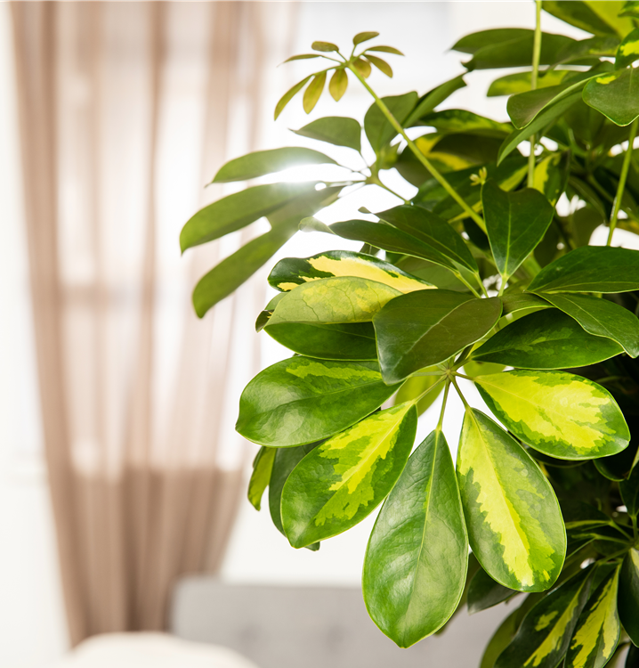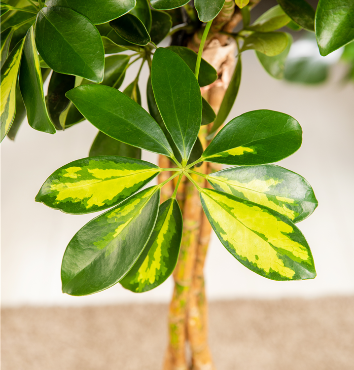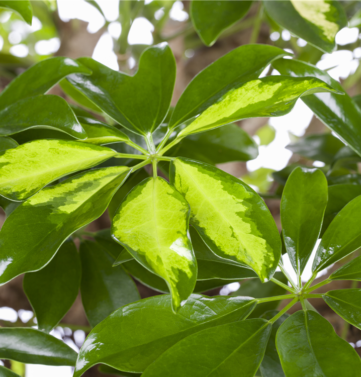 Die Kleine Strahlenaralie 'Gold Capella' (Schefflera arboricola) ist eine Pflanze mit dekorativen, gelb-grünen Blättern. Sie sind handförmig, eiförmig. Diese strauchartige und aufrechte Pflanze gedeiht am besten an einem sonnigen bis halbschattigen Standort.