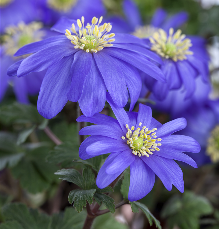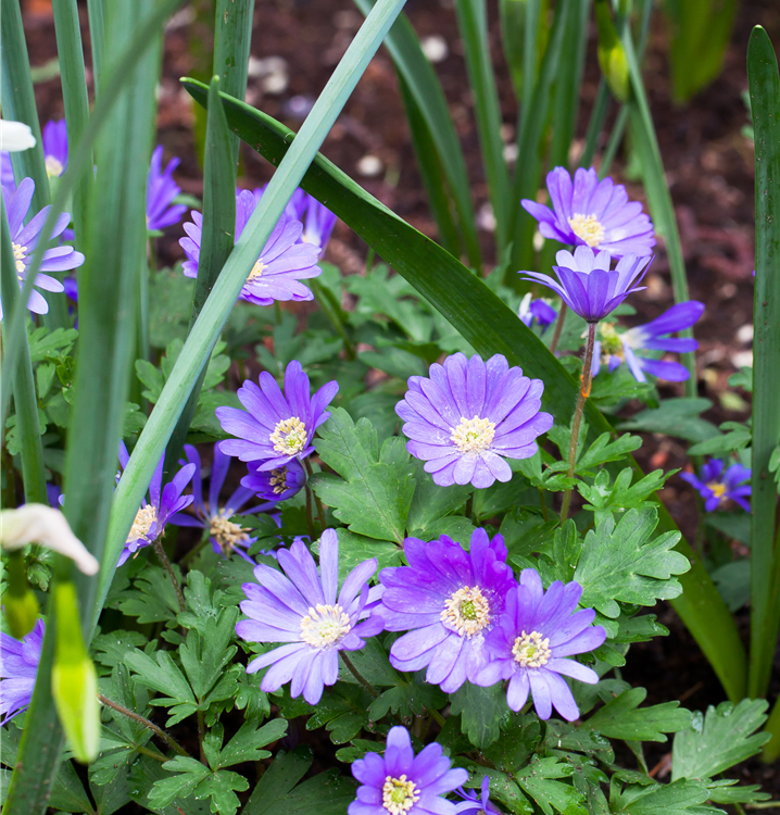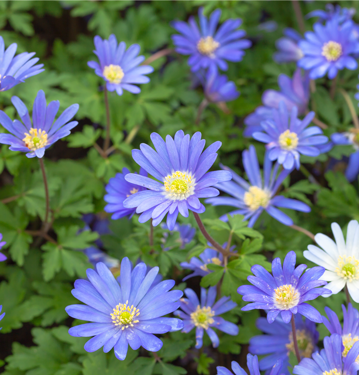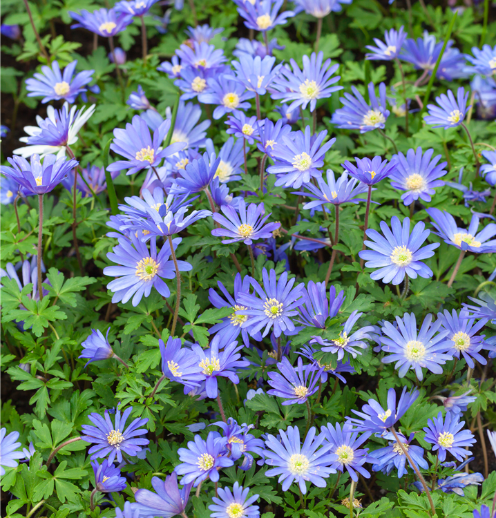 Das Strahlen-Windröschen (Anemone blanda) bringt ansehnliche, blaue Blüten von März bis Mai hervor. Bevorzugt wird ein durchlässiger, humoser, kalkfreier Boden in sonniger bis halbschattiger Lage. Die rhizombildende, horstbildende Pflanze erreicht gewöhnlich eine Höhe von 8 - 10 cm und wird bis zu 10 cm breit.