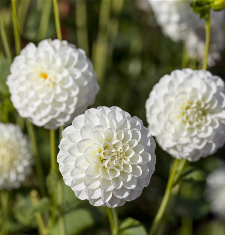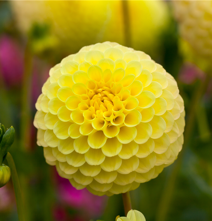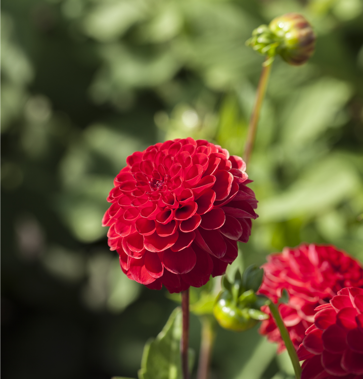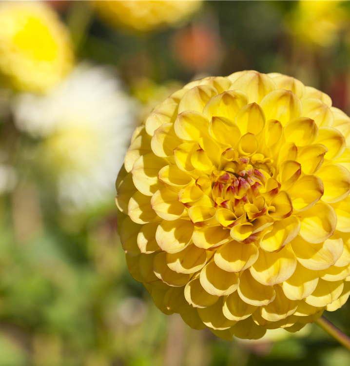 Die Pompon-Dahlie (Dahlia) bringt ansehnliche, rote, rosafarbene, weiße, gelbe, orangefarbene Blüten von Juli bis Oktober hervor. Sie bevorzugt humosen, sandigen Boden in sonniger windgeschützter Lage. Die buschige Pflanze erreicht gewöhnlich eine Höhe von 0,3 - 1,5 m und wird bis zu 1 m breit.