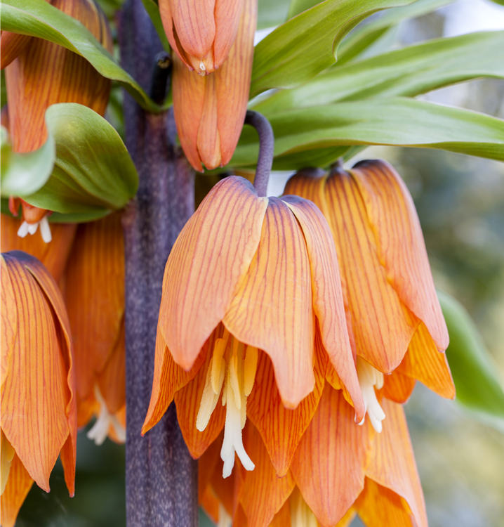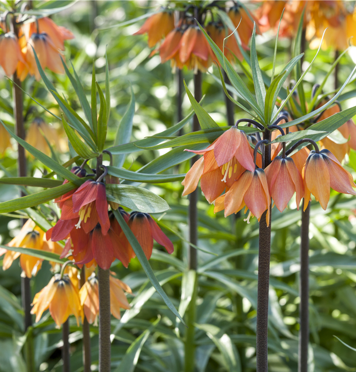 Die Kaiserkrone (Fritillaria imperialis) bringt ansehnliche, orange-rote Blüten von April bis Mai hervor. Bevorzugt wird ein durchlässiger, nährstoffreicher Boden in sonniger bis halbschattiger Lage. Die aufrechte Pflanze erreicht gewöhnlich eine Höhe von 1 - 1,2 m und wird bis zu 40 cm breit.
