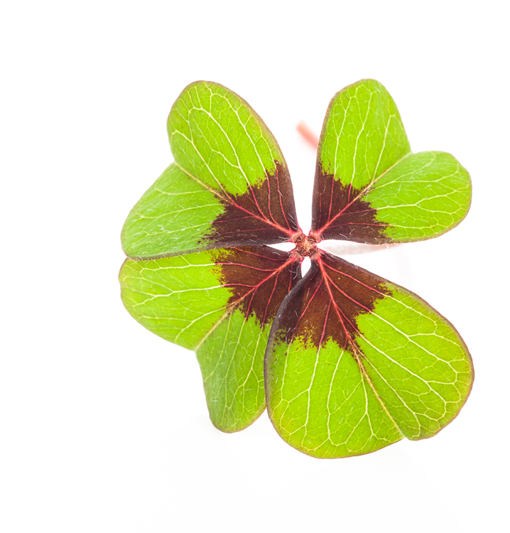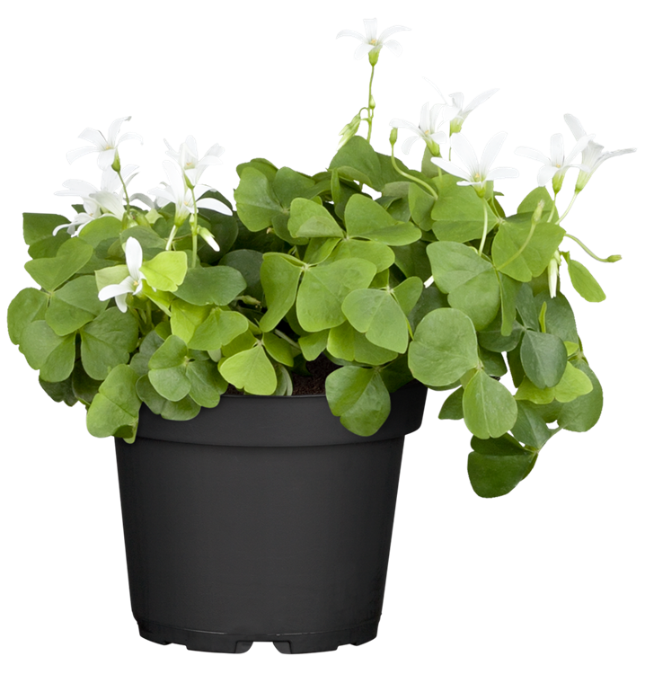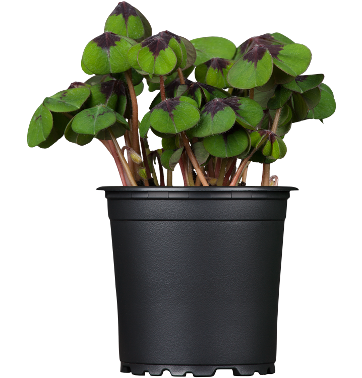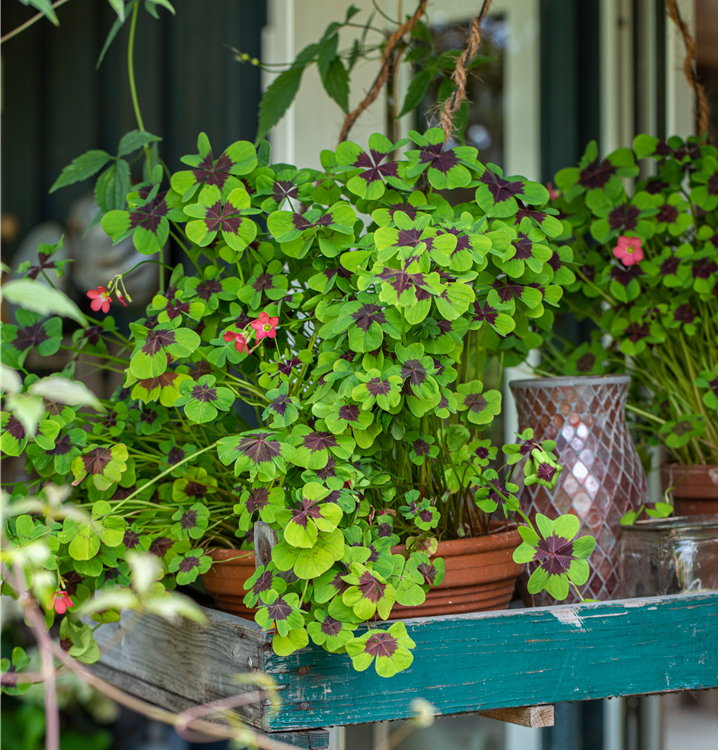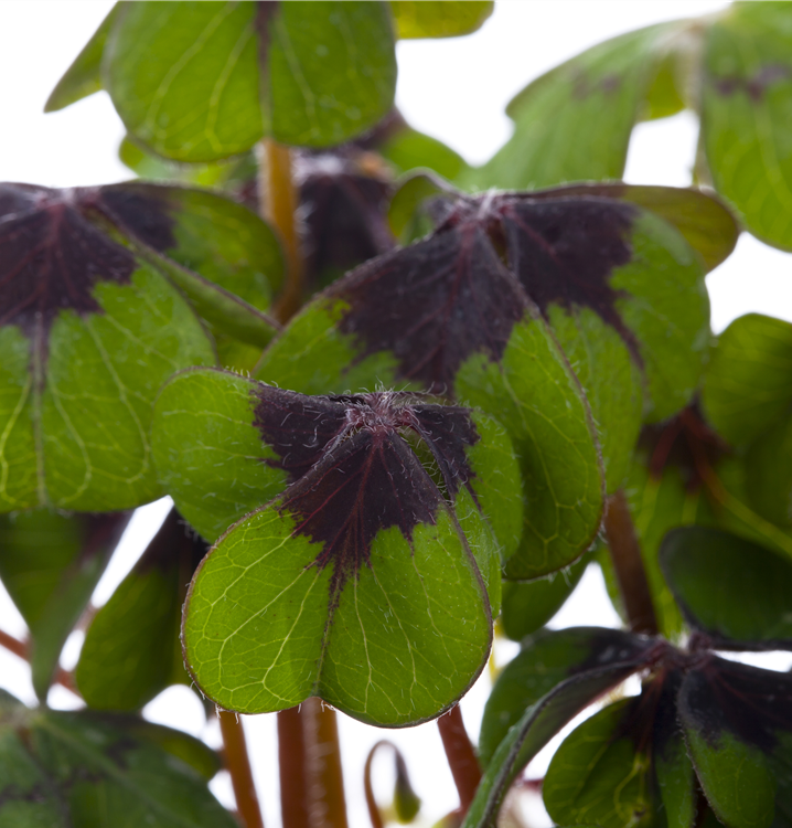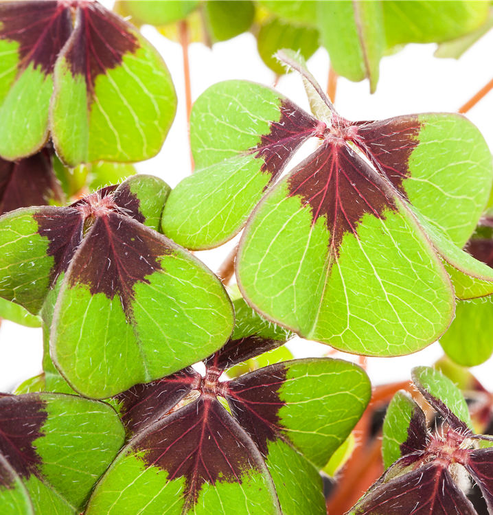 Die sommergrünen Blätter des Glücksklees sind zweifarbig, herzförmig.