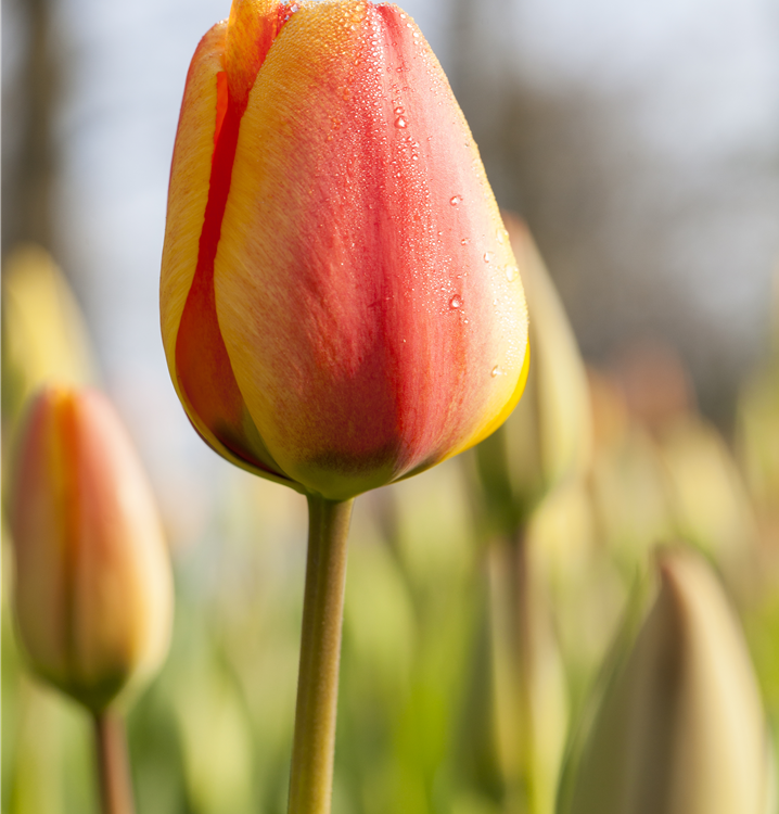 Die Triumph Tulpe (Tulipa) bringt ansehnliche, bunte, angenehm duftende Blüten von April bis Mai hervor. Bevorzugt wird ein durchlässiger, humoser Boden in sonniger Lage. Die schlanke, aufrechte Pflanze erreicht gewöhnlich eine Höhe von 40 - 60 cm und wird bis zu 10 cm breit.