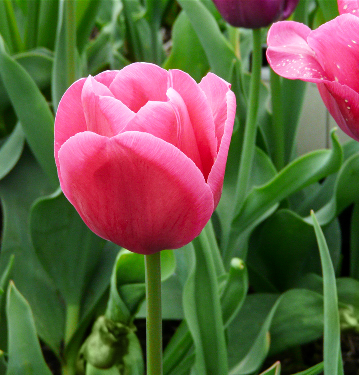 Die sommergrünen Blätter der Triumph Tulpe sind dunkelgrün, lineal.